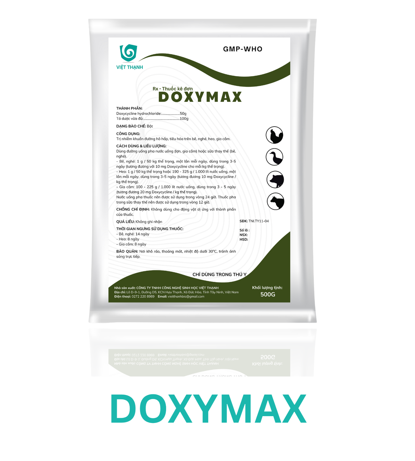 – Gia cầm: 100 – 225 g / 1.000 lít nước uống, dùng trong 3 – 5 ngày (tương đương 20 mg Doxycycline / kg thể trọng).