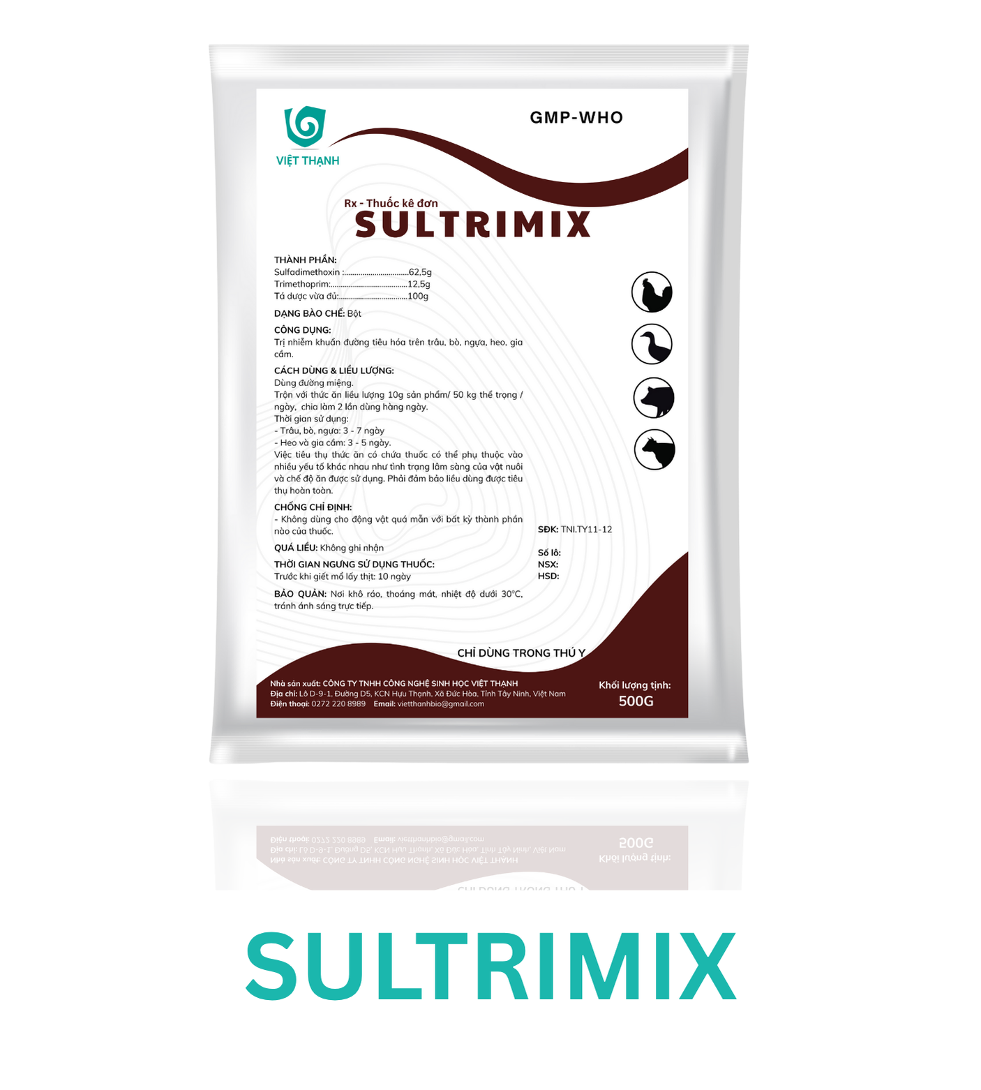 Trị nhiễm khuẩn đường tiêu hóa trên trâu, bò, ngựa, heo, gia cầm.